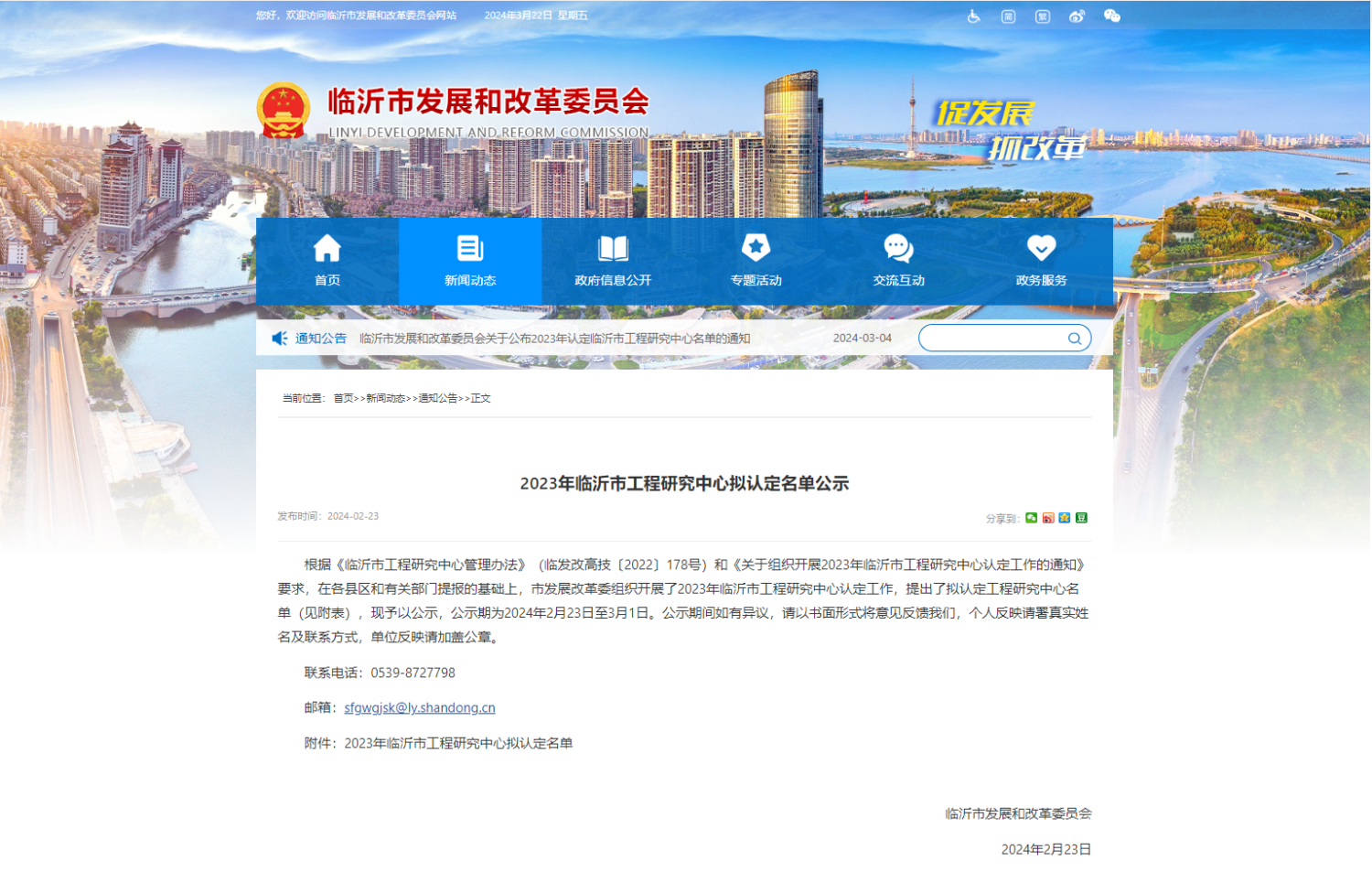 公司近期收到由臨沂市發(fā)展和改革委員會(huì)發(fā)布《2023年臨沂市工程研究中心擬認(rèn)定名單公示》,經(jīng)專家評(píng)審和網(wǎng)上公示,公司申報(bào)的“臨沂市工程技術(shù)研究中心”進(jìn)入擬認(rèn)定名單。